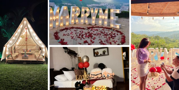 Por supuesto, experimenta una propuesta de matrimonio en Bucaramanga con sorpresa y magia en una Cabaña Alpina diseñada para enamorar. Aquí serán recibidos con un cóctel de bienvenida, disfrutarán de una deliciosa cena romántica, fogata con malvaviscos, desayuno, almuerzo, sauna, piscina, juegos de mesa y una relajante malla catamarán. Al llegar juntos a la cabaña, encontrarán una decoración especial para la propuesta con globos, detalles románticos, chocolates y un hermoso letrero que pregunta: ¿Te quieres casar conmigo? o tenemos otro espacio privado, iluminado donde puedes tener la cena romántica y se decora con la propuesta de matrimonio especial.